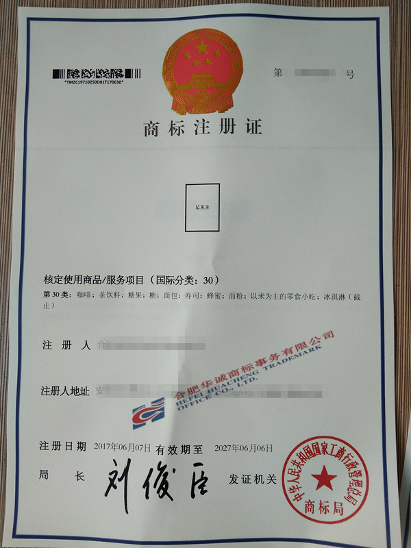 最新下达的商标注册证