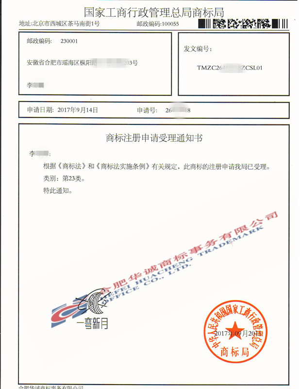 您委托我所代理商标注册申请,名称为“一弯新月”23类商标已被国家商标局受理。