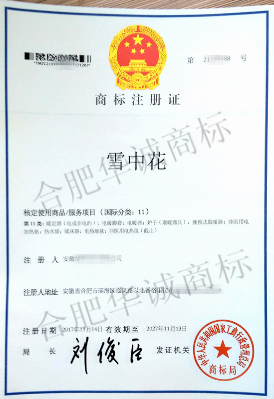 您委托我所代理商标注册申请,名称为“雪中花” 11类商标注册证已下达。