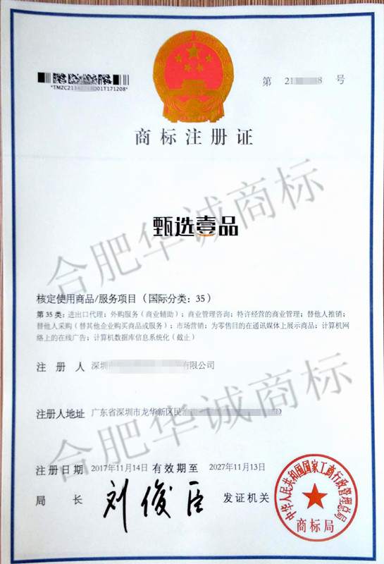 您委托我所代理商标注册申请,名称为“甄选壹品” 35类商标注册证已下达。
