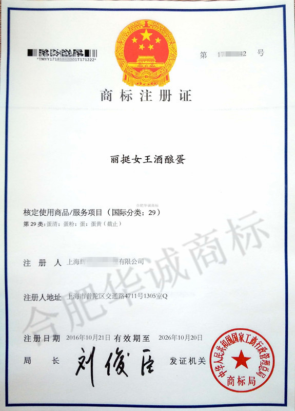 “丽挺女王酒酿蛋”29类商标注册证下达