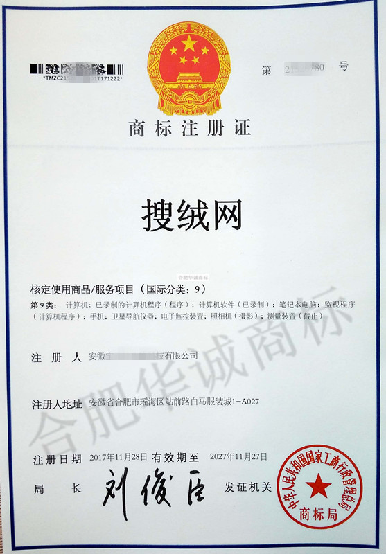 “搜绒网”9类商标注册证下达
