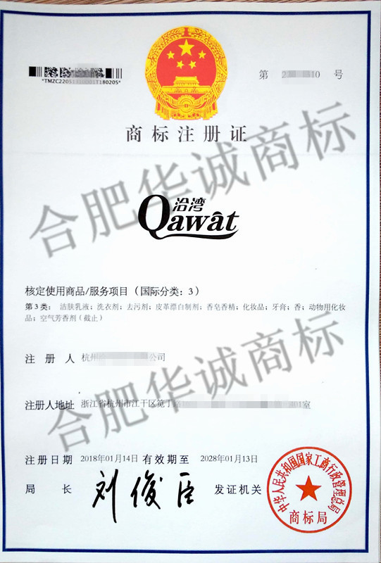 您委托我所代理商标注册申请,名称为“洽湾” 3类商标注册证已下达。