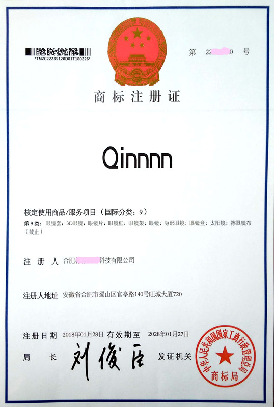 您委托我所代理商标注册申请,名称为“Qinnnn” 9类商标注册证已下达。