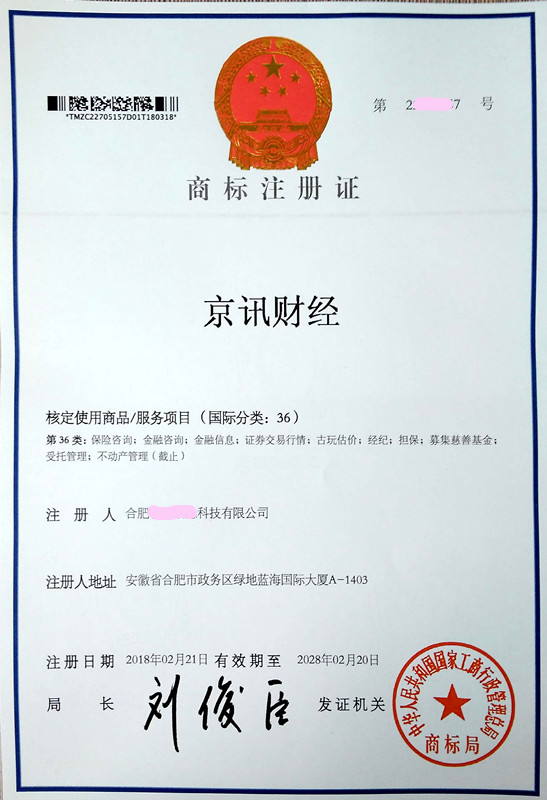 您委托我所代理商标注册申请,名称为“京讯财经”36类商标注册证已下达。
