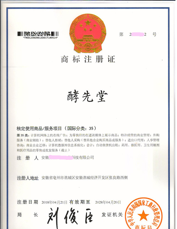 “酵先堂”35类商标注册证下达