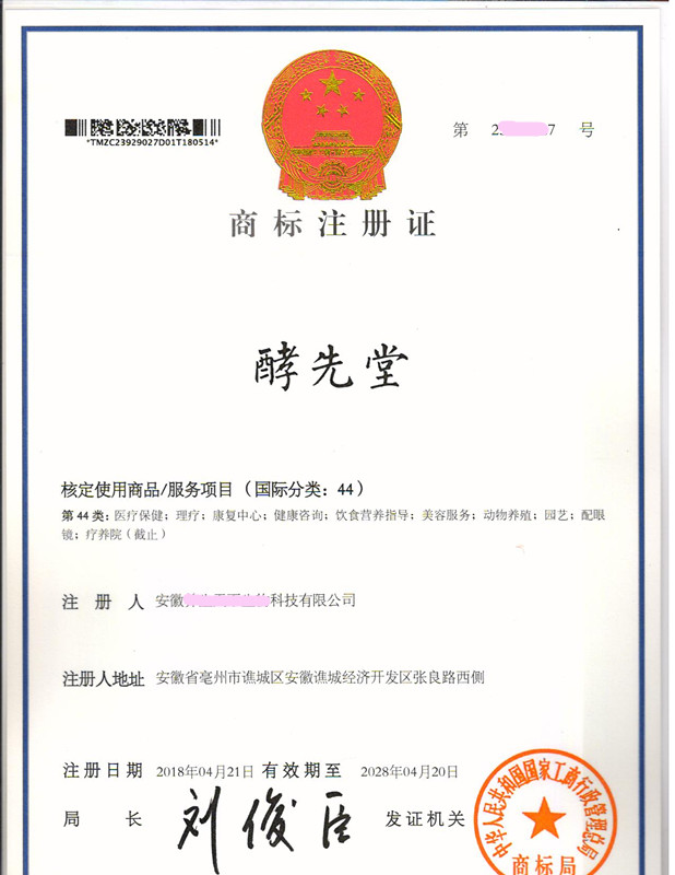 您委托我所代理商标注册申请,名称为“酵先堂”44类商标注册证已下达。