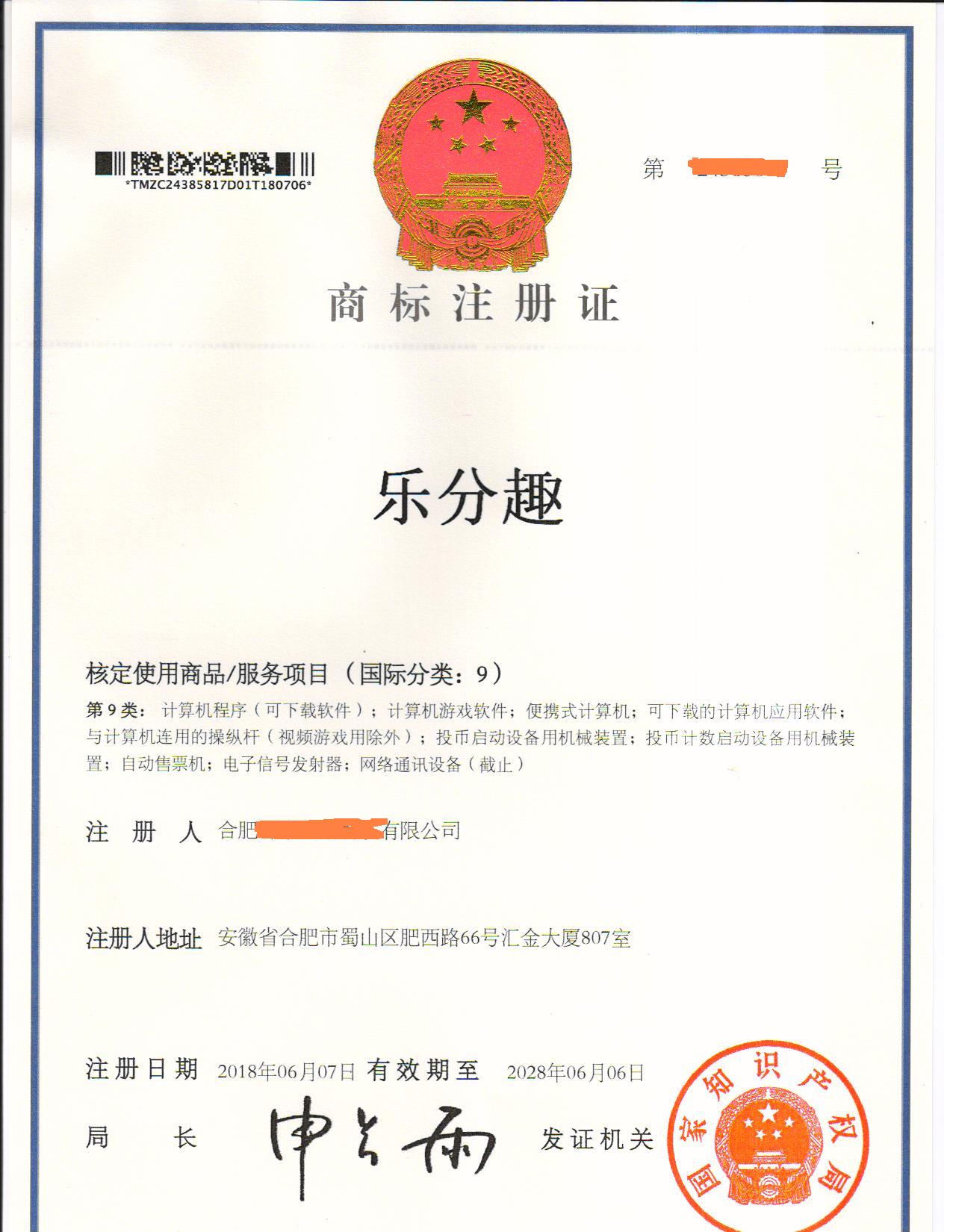 “乐分趣”9类商标注册证下达